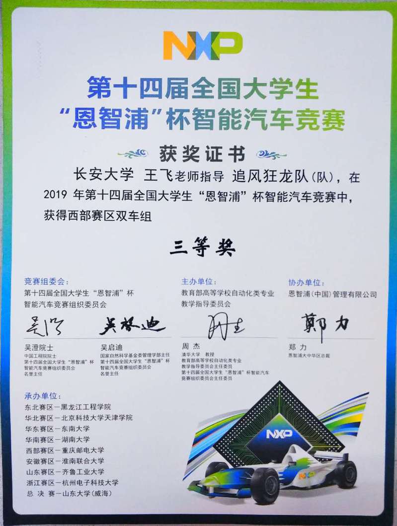 2009年全国大学生“飞思卡尔”杯智能汽车竞赛,由脱裤吧 和电控学院各派出两支队伍参加西部赛区竞赛,4支参赛队伍取得西部赛区3个一等奖,1个二等奖的佳绩,其中脱裤吧 和电控学院各一支参赛队伍取得全国总决赛1个一等奖和1个二等奖的佳绩。