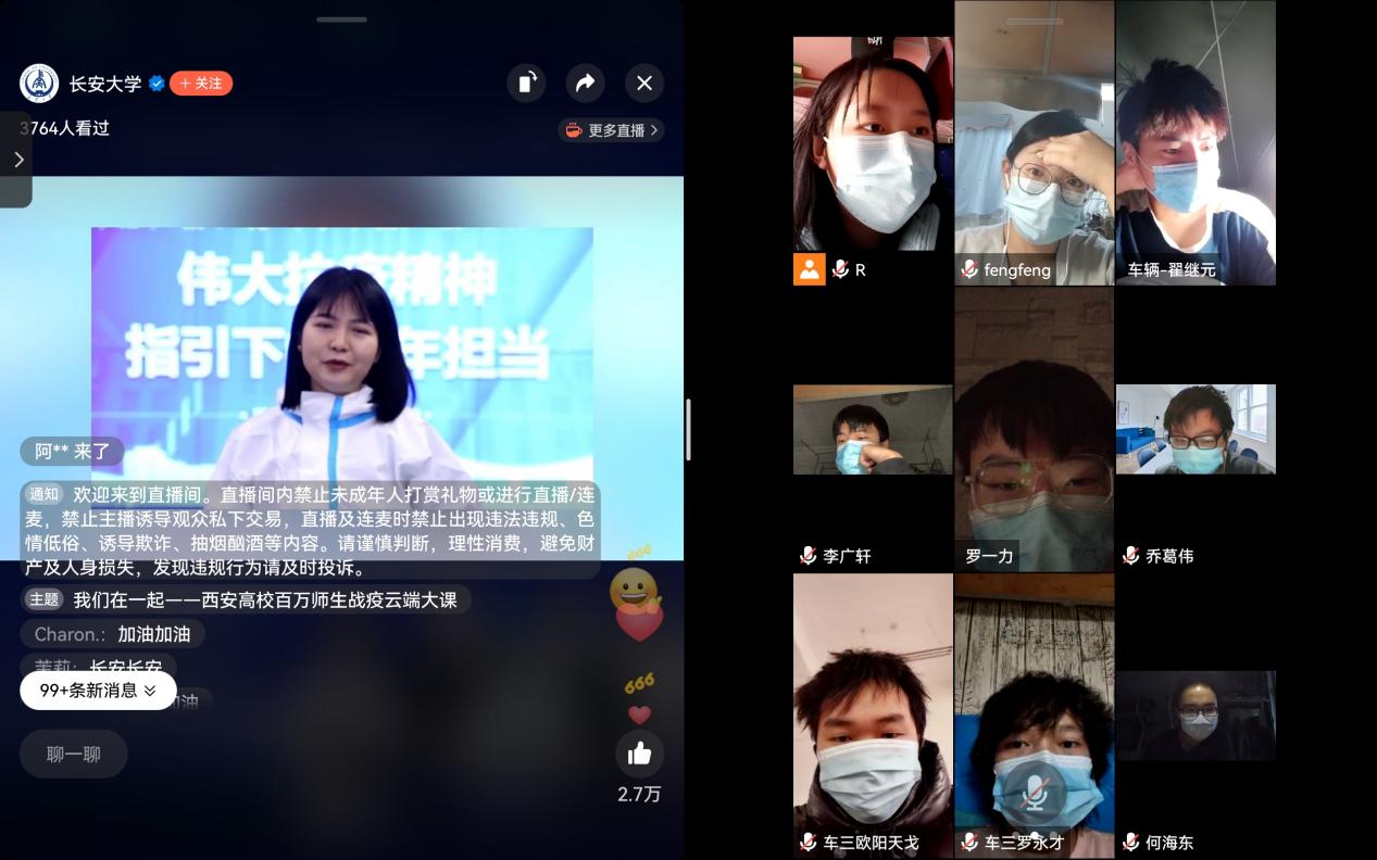 “我们在一起——西安高校百万师生云端思政大课”由陕西省教育工委、教育厅主办,学习强国陕西学习平台、天翼云商务直播平台、西安市教育电视台协办。本次活动中,由学生志愿者代表分享参加战疫志愿服务的故事,普通学生代表分享疫情期间的宿舍学习生活情况,隔离学生代表分享隔离生活情况,辅导员代表讲述抗疫一线的故事,传染病学专家为学生解答校园疫情防控知识等内容。课堂内容充实,教育效果突出,是一堂生动的云端思政大课。
