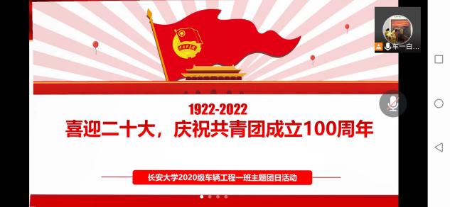 2022年4月27日,为了迎接和学习宣传贯彻党的二十大主线,结合庆祝建团100周年,强化广大团员青年的政治品格,传承红色血脉,夯实各位共青团员的爱国精神,2020级车辆工程一班团支部特此开展“喜迎二十大,庆祝共青团成立100周年”主题团日活动,此次活动为严格落实防疫要求,选择线上腾讯会议的方式开展。