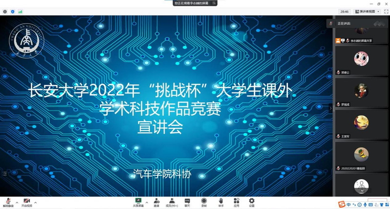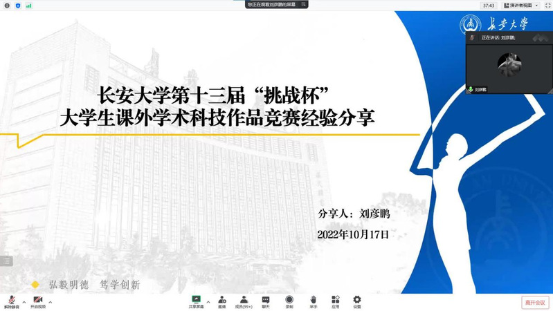 2022年10月17日晚,脱裤吧 “挑战杯”大学生课外学术科技作品竞赛宣讲会在线上顺利举行。脱裤吧 大学生科技创新创业协会指导老师许超然、脱裤吧 2019级本科生刘彦鹏、王涔宇同学参与本次会议的宣讲。