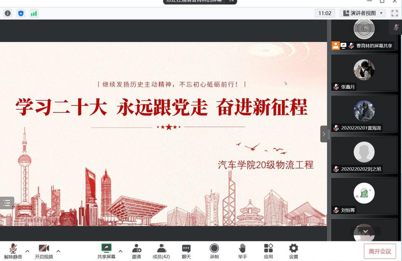 为深入学习党的二十大精神,全面贯彻习近平新时代中国特色社会主义思想,10月24日,脱裤吧 2020级物流工程专业以线上会议的形式开展了“学习党的二十大,永远跟党走,奋进新征程”主题团日活动,活动由物流一班团支书曹育林主持,2020级物流工程专业全体同学和2020级辅导员杨磊参加。