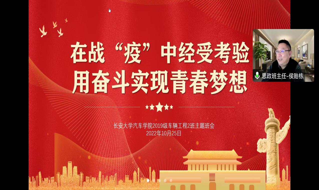 为做好疫情防控工作,学好用好抗疫精神,学习党的二十大报告中习近平总书记对青年的殷切嘱托,激发班级同学传承奋斗精神,勇担青春使命的责任感,10月25日,2019级车辆工程2班通过腾讯会议线上开展了“在战疫中经受考验,用奋斗实现青春梦想”主题班会。本次班会由思政班主任侯贻栋主持,辅导员杨倩及班级全体同学参加。