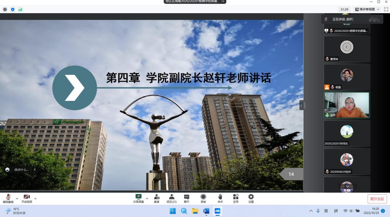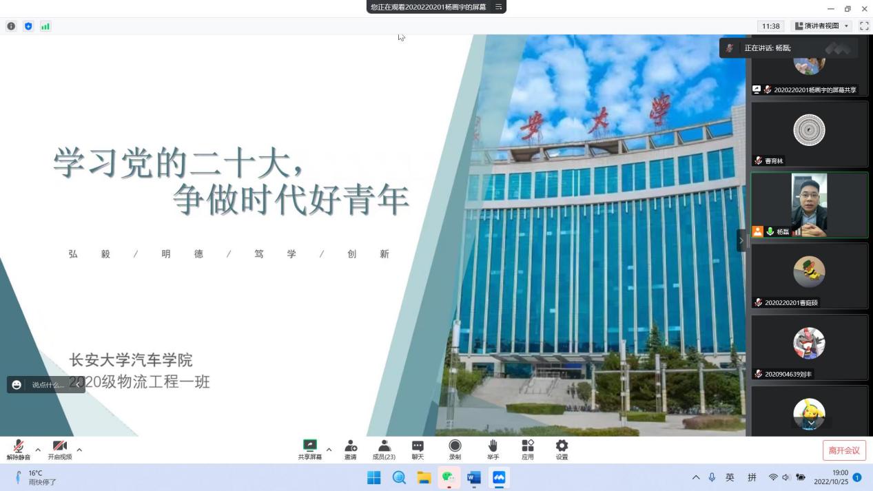 为深入学习党的二十大精神,全面落实好学校防疫工作各项要求,10月25日,脱裤吧 2020级物流工程一班举办“学习党的二十大,争做时代好青年”主题线上班会。脱裤吧 副院长赵轩教授出席本次班会,2020级物流工程一班全体同学参会,本次班会由2020级辅导员杨磊主持。