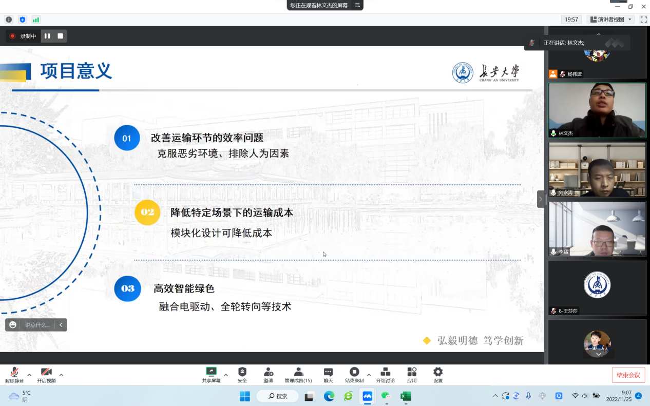 参加本次验收会的项目共26个,其中25个中期验收,1个结题验收,分两组参加答辩。学院邀请了六位大创项目指导经验丰富的教师担任评审专家。按照学校疫情防控管理要求,本次答辩会通过腾讯会议在线上进行。答辩会采取“PPT项目展示+评委指导、问答”的形式开展。项目涉及无人驾驶、智能网联、新能源、智慧物流、智能交通等多学科领域。各项目团队负责人围绕项目进展情况、取得的阶段性研究成果、存在的问题及后期的解决路径、下一阶段工作重点等内容进行汇报。评审专家逐一进行严谨专业的点评和指导,指出项目存在的不足,为大创项目的顺利开展提出了中肯建议。