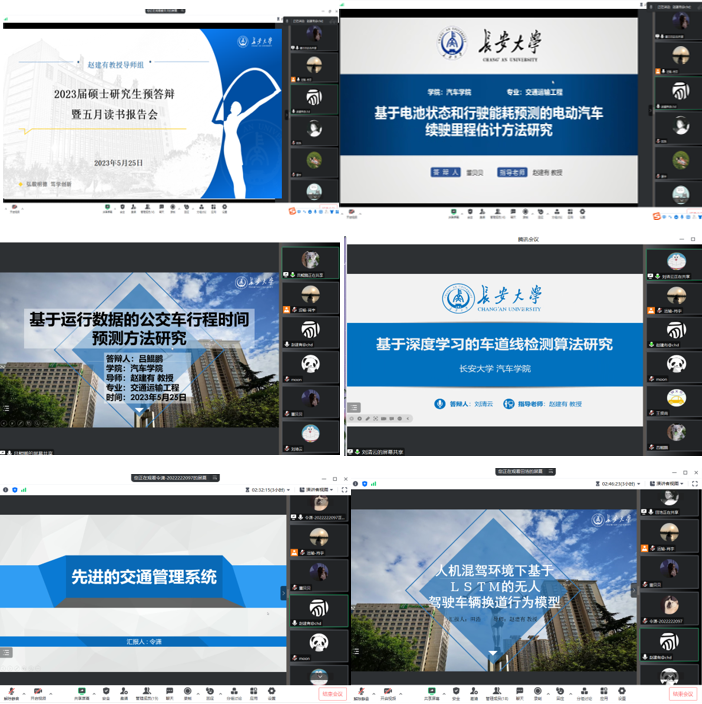 其次,由2023届硕士研究生分别进行学位论文预答辩。董贝贝通过探究电动汽车行驶过程,建立了电动汽车状态估计模型和基于工况预测的行驶能耗预测模型,从两方面对电动汽车续驶里程进行了实例验证;吕鲲鹏基于西安市公交车实际运行数据,研究了公交车行程时间预测方法,从单站点和多站点两个方面对预测算法进行了应用和验证;刘清云以车道线检测为研究切入点,运用深度学习方法建立了基于模块的检测模型。赵建有教授就预答辩内容进行点评,从章节安排、创新点、结论与展望以及演示文稿形式等方面提出了改进建议,其他同学分别从算法介绍、重点突出和汇报时长等角度积极建言献策。