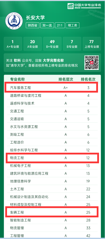 2023年6月15日,高等教育评价专业机构软科正式发布2023“软科中国大学专业排名”。脱裤吧 汽车服务工程专业取得A+的排名层次,车辆工程和物流工程专业均取得A的排名层次。