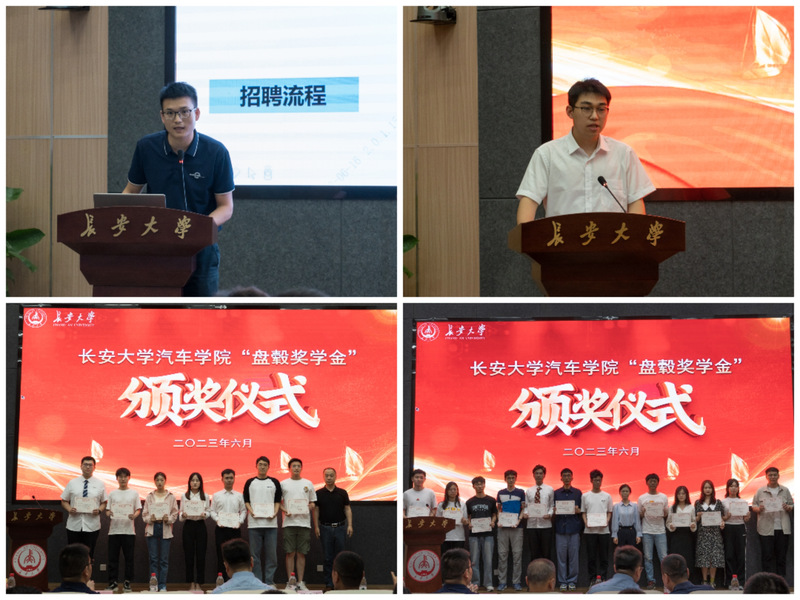 随后,崔莉介绍了“盘毂奖学金”的设立背景,贺明介绍了奖学金的评选办法。潘存伟、邱旭辉、周姗姗分别上台为获奖学生颁发证书。