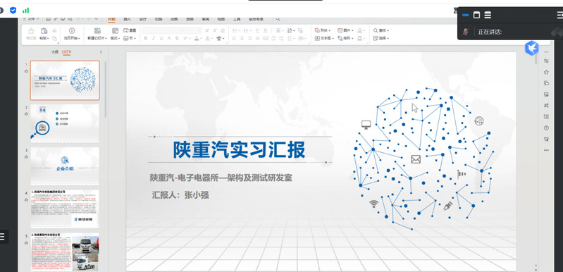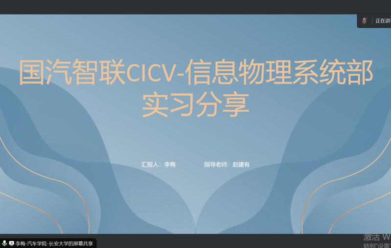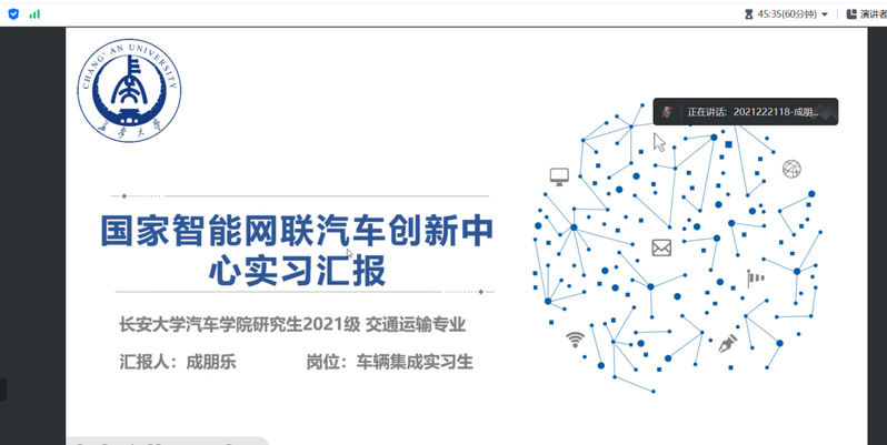 本次会议,硕士研究生李梅分享了有关国汽智联CICV-信息物理系统部的实习经历,主要包括智能汽车信息物理系统、最小原型系统方案编写、交通流实时监测与态势推演等内容;张小强主要从企业介绍、实习内容、实习收获三个方面分享了暑期在陕西重型汽车有限公司的实习经历,简要阐述了陕汽天行健车联网服务系统、整车动力HIL测试、基于ZCANPRO测试仪表盘功能等工作;成朋乐分享了在国家智能网联汽车创新中心车辆集成岗位的实习经历,从岗位角度出发,汇报了实习期间有关车辆测试、问题分析、报告撰写、日常接待等工作内容;张正晴作了有关中国重汽实习汇报,主要分享了邻域搜索算法、禁忌搜索算法,Point Labeler点云标注工作、智能驾驶平台等工作内容。