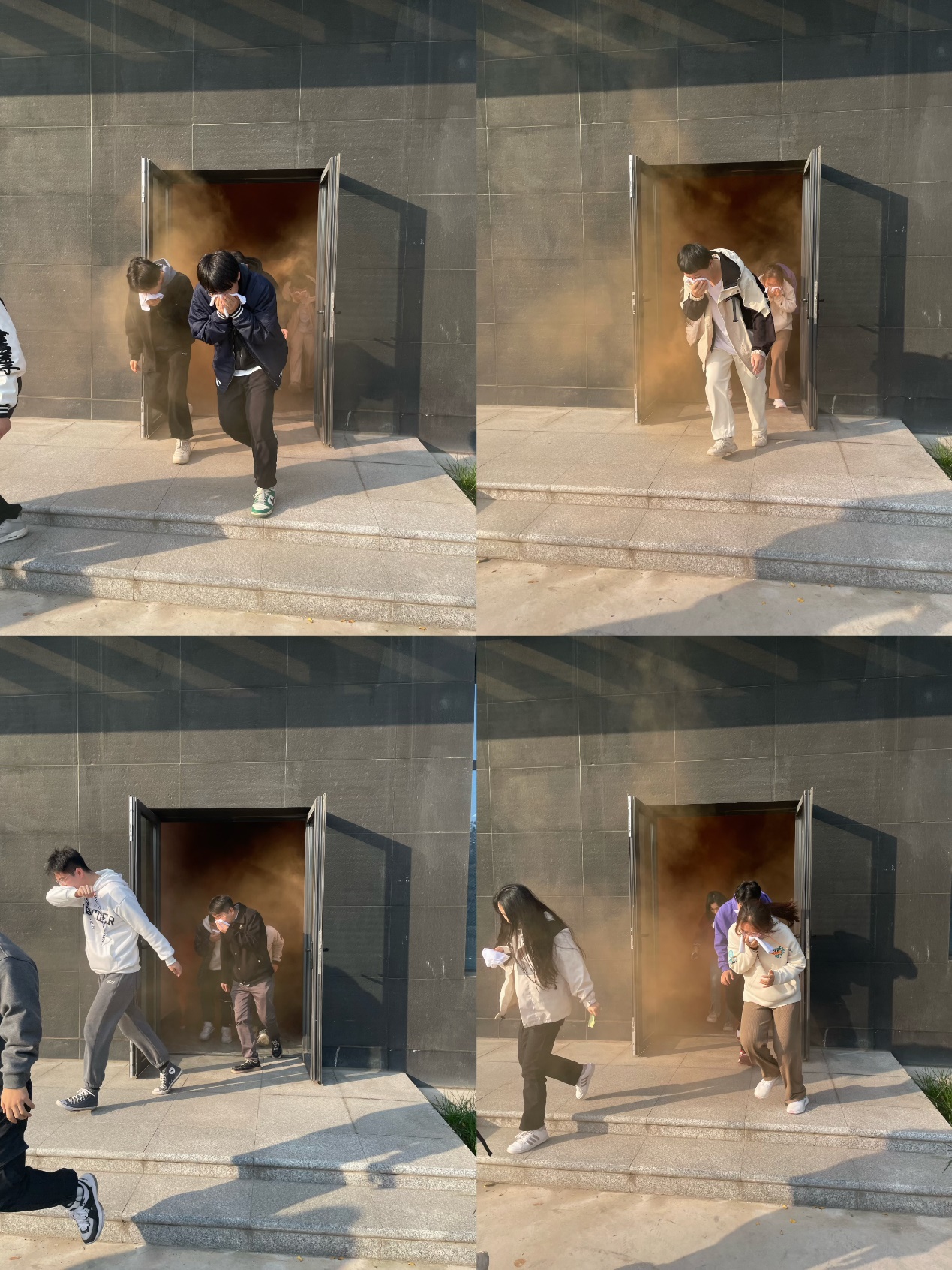 随后,在消防安全专家的指导下,脱裤吧 师生开展了消防安全演练。听到警报声后,在老师的带领下学生们弯着腰、猫着步、用毛巾捂住口鼻,沿着疏散通道快速前进,有序撤离到学院楼东侧的安全地带,之后张强老师清点人数,全体师生安全撤离,用时仅2分钟。
