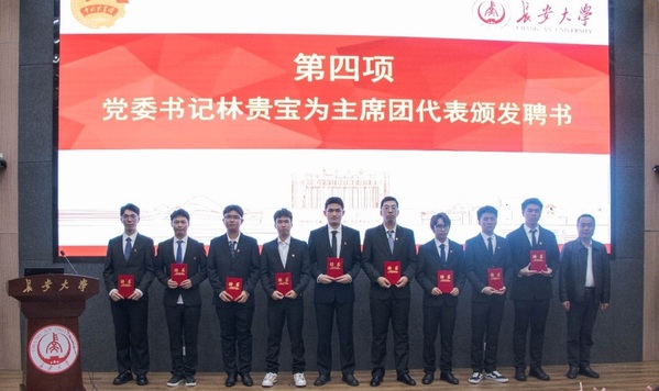 学生工作办公室主任郑文捷宣读《新一届学生组织及社团聘任文件》。林贵宝为主席团代表颁发聘书,崔莉为部门负责人代表颁发聘书。