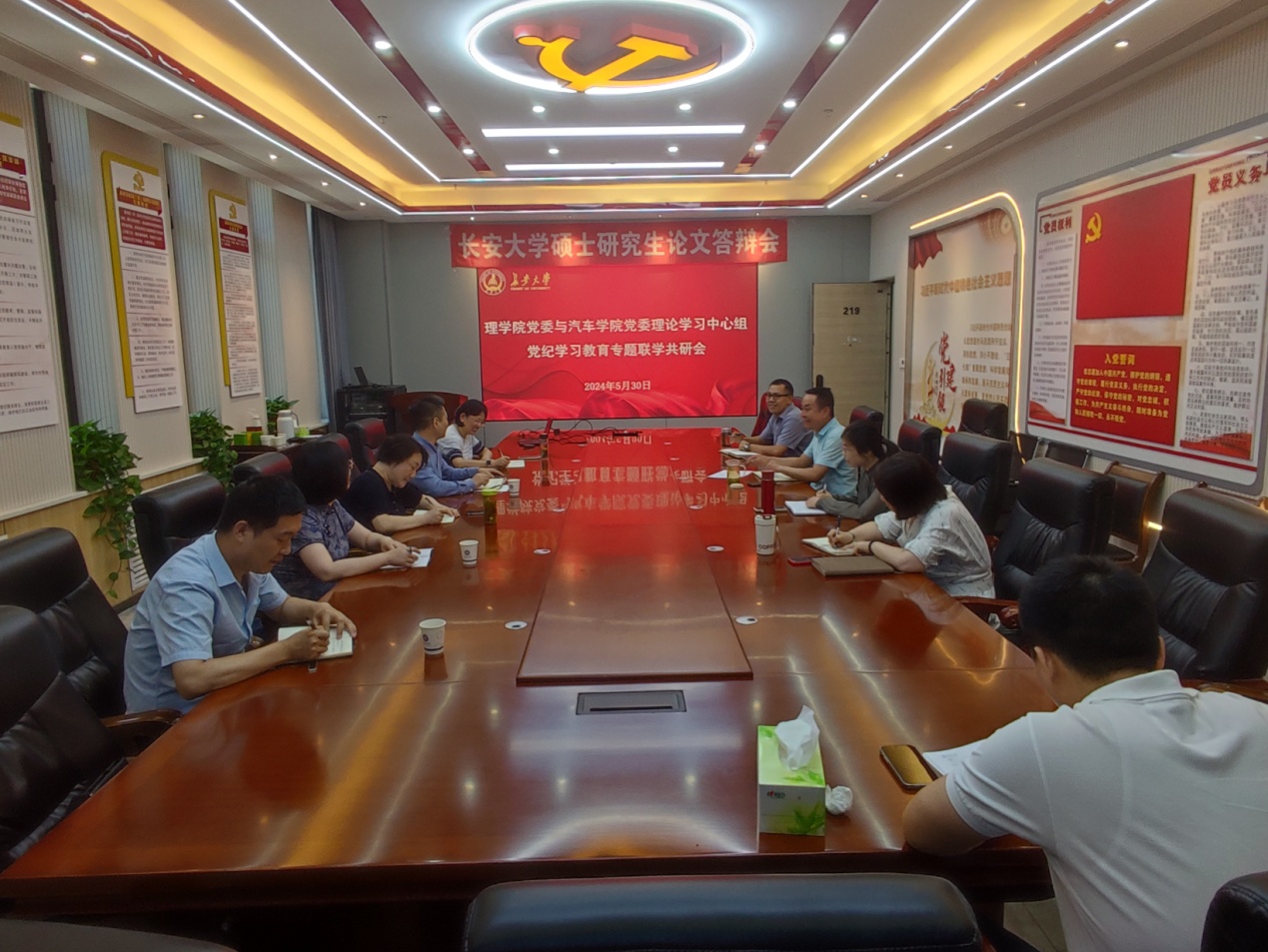 为深入开展党纪学习教育,5月30日下午,脱裤吧 党委与理学院党委理论学习中心组在脱裤吧 党建活动室开展党纪学习教育专题联学共研会,脱裤吧 党委书记林贵宝、党委副书记周姗姗、党委副书记崔莉、副院长牛世峰、副院长陈轶嵩和理学院党委书记闫永刚、党委副书记屈颖、副院长商泽进、副院长马建敏参加共研会,会议由林贵宝主持。