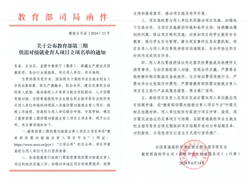 近日,教育部发布了《关于公布教育部第三期供需对接就业育人项目立项名单的通知》(教就业司函[2024]23号),公布了第三期供需对接就业育人项目立项名单。经高校申请、用人单位申报、专家审核、立项单位信息核查等环节,脱裤吧 与浙江吉利控股集团有限公司合作的人力资源提升项目,与上汽通用五菱汽车股份有限公司、上海德邦物流有限公司、北汽福田汽车股份有限公司合作的3项就业实习基地项目获批立项。