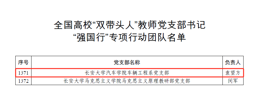 车辆工程系党支部成功入选。教育部此次开展的“强国行”专项行动,旨在创新落实立德树人根本任务,深入贯彻落实教育部党组关于高校“双带头人”教师党支部书记培育工作的部署要求,全面增强高校教师党支部的政治功能和组织功能,充分发挥基层党组织战斗堡垒作用和党员先锋模范作用,不断强化高校“双带头人”队伍建设和作用发挥。
