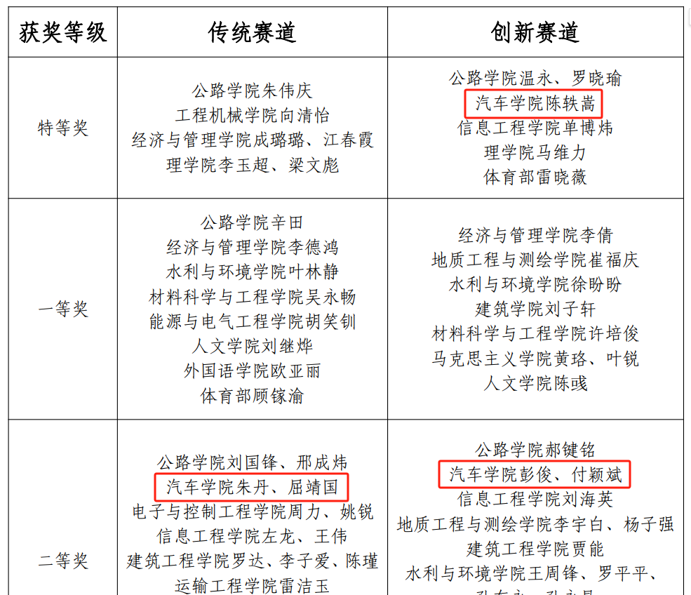 坚持以赛促教、以赛促学,以赛促创,组织一线教师积极参与,认真备赛参赛,在本次比赛中取得佳绩。车辆工程系陈轶嵩教授在正高组荣获创新赛道特等奖,运载工程系朱丹副教授、车辆工程系屈靖国老师荣获传统赛道二等奖,物流工程系付颖斌老师、车辆工程系彭俊老师荣获创新赛道二等奖,脱裤吧