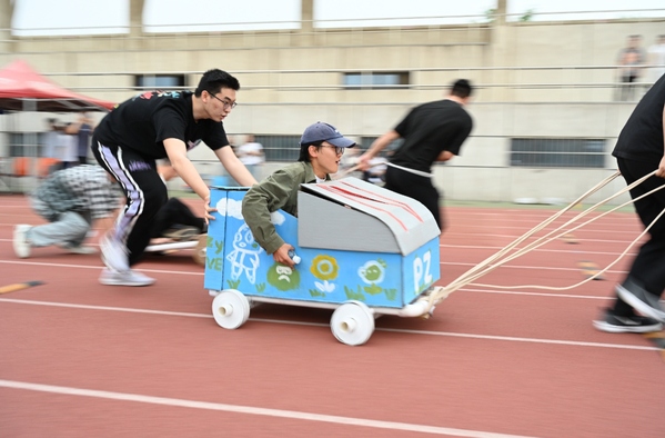 决赛设置两个环节,在创意赛环节,各参赛队伍需详细介绍作品的创作理念。评委老师从造型外观的独特性、设计理念的创新性、创意想象的丰富性及讲解介绍的流畅性四个维度进行专业评分。在竞速赛环节,每支队伍需要在规定的赛道上进行团队合作,把纸箱车最快的送到终点。