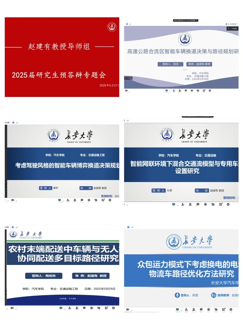 随后硕士研究生依次进行了汇报。硕士研究生田浩进行了汇报,田浩的学位论文题目为:《高速公路合流区智能车辆换道决策与路径规划研究》,田浩从匝道合流区汇入特性分析、基于深度强化学习的换道决策问题研究、智能车辆合流区汇入轨迹规划研究、汇入车辆联合仿真分析等几个方面进行了汇报,并回答了评阅专家的问题。康宇的学位论文题目为:《考虑驾驶风格的智能车辆博弈换道决策规划研究》。康宇从驾驶人驾驶风格识别研究、基于博弈论的驾驶行为决策研究、车辆换道轨迹规划研究、仿真场景搭建及算法验证等方面进行了汇报。令潇的学位论文题目为:《智能网联环境下混合交通流模型与专用车道设置研究》。令潇从智能网联交通系统理论体系、智能网联环境下车辆跟驰模型研究、智能网联环境下车辆换道模型研究、专用车道设置与交通流仿真分析等四个方面进行了汇报。陶旭秋的学位论文题目为:《农村末端配送中车辆与无人机协同配送多目标路径研究》。陶旭秋从研究背景及意义,方法及思路,模型构建、算法设计以及算例实验分析等方面进行了汇报,以农村末端配送为对象,构建协同配送模式,设计算法并以算例求解分析。侯雪的学位论文题目为:《众包运力模式下考虑换电的电动物流车路径优化方法研究》。侯雪从考虑换电的众包路径优化模型构建、考虑换电的众包路径优化算法设计、实例验证分析等方面展开,针对电动物流车的充换电模式及换电必要性进行了分析,考虑了电池充换电起始电量对运营效率、配送成本以及电池寿命的重要影响;并回答了评阅专家的问题,展示了按评阅专家意见修订的勘误表。
