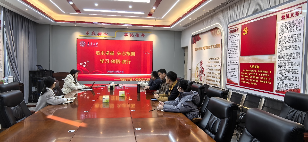 12月24日下午,智能车辆工程系党支部召开2025年下半年党员基本培训第二次集中大课学习交流研讨会。会议回顾了薛其坤院士《追求卓越 矢志报国——在新征程上践行共产党人的初心与使命》专题党课的内容,并紧密结合高校教育教学与科研工作实际,组织开展交流研讨。会议由党支部书记张硕主持,智能车辆工程系全体教师党员参加。